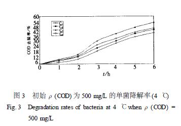 單一菌種降解能力測定:配水主要用牛肉膏蛋白胨配制,使原水COD 值為500 mgPL. 實(shí)驗(yàn)條件:水溫4 ℃,pH 值7. 0~7. 2 ,將已培養(yǎng)好的OD值(吸光度) 在0. 4~0. 6 的處于對(duì)數(shù)期的菌種以3000 rPmin 的轉(zhuǎn)數(shù)離心20 min 后,以磷酸緩沖液稀釋至D650 0. 4 (650 nm 波長的吸光度為0. 4) , 按10 %接種量接種,曝氣時(shí)間6 h. 實(shí)驗(yàn)結(jié)果見圖3.