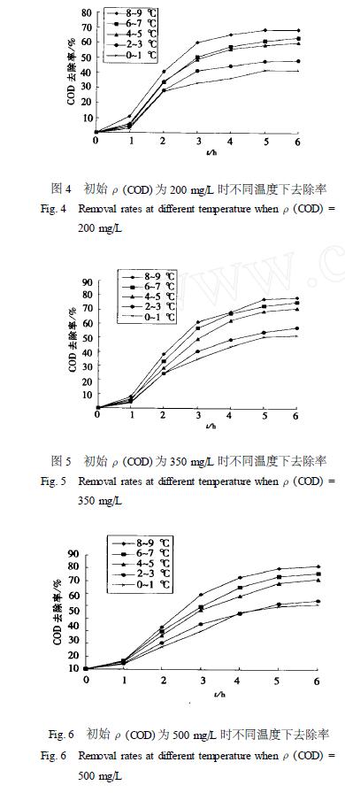 實(shí)驗(yàn)條件及方法同“2. 3”,實(shí)驗(yàn)用水ρ (COD)在200~30 mgPL 各菌接種量為2. 5 % ,總接種量 圖4~6 表明:隨著溫度的降低耐低溫混合菌的COD 去除率隨之逐漸下降,當(dāng)溫度繼續(xù)下降到