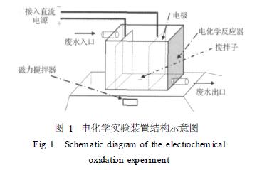 實驗裝置示意圖見圖1。實驗中采用序批方式連續(xù)進行電催化處理。電解實驗裝置包括: ①方形(15 cm ×15 cm ×15 cm)玻璃鋼電解槽一個; ②自制網(wǎng)格狀鈦基釕系摻銻氧化物電極,電極大小15 cm×10 cm,厚014 cm,有效面積01022 m2 ,陰極為不銹鋼網(wǎng); ③直流穩(wěn)流電源及其他相應(yīng)設(shè)施;其中直流電源、電極和電解槽是核心設(shè)備。