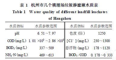 實驗中水樣選取自杭州市幾個垃圾填埋場滲濾液收集池出口處廢水。水質(zhì)情況見表1。