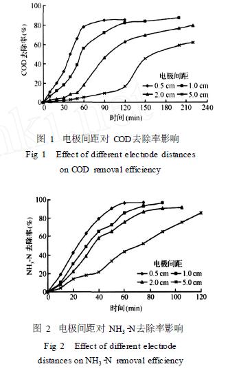 電催化氧化處理垃圾滲濾液涉及因素較多。實驗中以COD和NH32N的去除率作為效果指標,以能耗作為經(jīng)濟性指標。考慮極板間距、電流密度、添加[C1- ]濃度等因素對垃圾滲濾液處理的影響。處理時電解槽中滲濾液以序批方式連續(xù)進行,處理時間以達到去除峰值為止,一般在120 min內(nèi),滲濾液水量1000 mL /次。