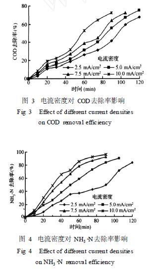 圖3和圖4表明:加大極板間的電流密度,污染物去除效率也明顯增加,達到去除高點需要的時間減少。電流密度215 ~ 1010 mA / cm2 時COD 和NH32N的去除率各不相同。電流密度增加, NH32N去除速率加快。COD 的去除率隨電流密度的增加也提高。(中國石油大學環(huán)境科學與工程系)