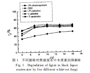 將5 株不同的白腐真菌接種至含載體的廢水培養基中, 培養條件為pH 6. 0, 葡萄糖1. 0 g/ L, 酒石酸銨0. 2 g/ L, 其他成分同1. 3, 將黑液廢水處理16 d, 實驗結果見圖1 和圖2.