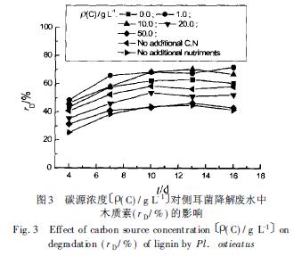 實驗結果表明( 圖3) , 葡萄糖質量濃度為1. 0 g/ L 和10. 0g / L 時木質素降解率大致相同, 在d 10 時, 木質素降解率分別為68%和67%, 木質素含量從920 mg/ L 分別降低至294 mg/L 和304 mg/ L. 但在d 7 時, 1. 0 g/ L 條件下已有65%的木質素降解, 而10. 0 g/ L 時木質素降解率為58%, 說明在1. 0 g/ L條件下不僅降解率高而且降解速率較快. 隨后降解率的提高不甚明顯. 葡萄糖濃度為20. 0 g/ L 和50. 0 g/ L 時, 木質素降解率明顯下降. 同時注意到, 在不添加碳氮源的情況下, 有無機鹽存在時木質素降解率可達58%, 沒有無機鹽時木質素降解率只有45%, 這一方面表明無機鹽對木質素的降解起著重要作用, 另一方面也表明白腐真菌可以利用廢水本身所含的某些物質生長并分泌木質素降解酶. 當僅僅不添加碳源( 0 g/ L 的情況) 時, 木質素降解率只低于1. 0 g/ L 和10. 0 g/ L 條件下的木質素降解率, 而比其他濃度條件下的木質素降解率都要高. 這說明白腐真菌雖然可以利用廢水本身所含的某些物質生長, 但在廢水中添加適量的碳源對于木質素降解率的提高是非常必要的, 而過多的碳源顯然不利于木質素的有效降解.