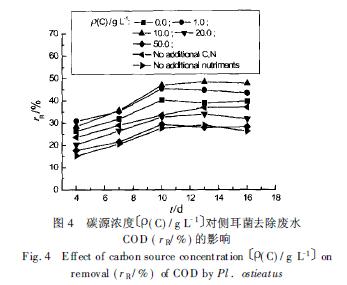 3. 3 廢水培養基中無機鹽的存在對菌絲的生長十分重要, 有助于白腐真菌的新陳代謝, 更好地發揮白腐真菌降解酶作用機制; 適量的碳氮源對掛膜也是不可缺少的.