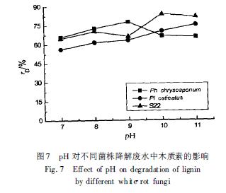 由圖7 和圖8 可見, 當廢水培養基的pH 在7. 0~ 9. 0 范圍內時, 黃孢原毛平革菌對黑液廢水的處理效果最佳, 木質素降解率和COD 去除率分別可達78%( pH 9. 0) 和65%( pH 8. 0) .在pH 10. 0 和pH 11. 0 條件下, 則以S22 菌株對黑液廢水的處理效果最好, 木質素降解率和COD 去除率分別可達84% ( pH10) 和69%( pH 10) , 木質素可從960 mg/ L 降為154 mg/ L, ( COD) 可從4 850 mg/ L 降為1 504 mg/ L. 有文獻報道Ox ysp orus sp. 和Pl. chrysosp or ium 能夠降解木質素, 它們的木質素降解率分別為70%和60%[ 14] , 均低于上述實驗結果. 此結果表明, 這3 種菌株在較強的堿性環境中都能顯著地降解木質素和去除COD, 同時掛膜生長的情況表明它們在堿性條件下均能生長掛膜. 但每種菌株生長的適宜pH 是不同的, 黃孢原毛平革菌和側耳菌在pH 7. 0, pH 8. 0 和pH 9. 0 條件下生長掛膜比較好, pH 10. 0 和pH 11. 0 時次之。而S22 菌株在pH 8. 0~10. 0 范圍內生長掛膜的情況差不多, pH 11. 0 時稍差一些. 由于造紙黑液廢水是強堿性的, 因此這3 株白腐真菌能夠在堿性環境中生長掛膜并降解木質素的獨特優勢, 為以生物技術治理造紙黑液的進一步研究奠定了基礎. 白腐真菌在堿性環境中的這種生長與降解木質素的能力尚未見報道.