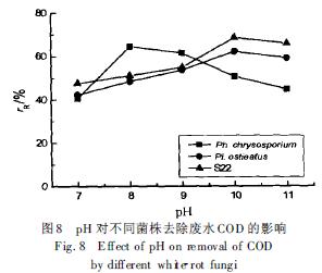 3. 4 黃孢原毛平革菌、側耳菌和S22 菌株在堿性較強的廢水中也能生長掛膜, 其中S22 菌在pH 10. 0 時木質素降解率和COD 去除率最高, 分別達84%和69%. 表明白腐真菌具有對造紙黑液廢水的適應能力以及顯著降解廢水中木素等污染物質的能力.