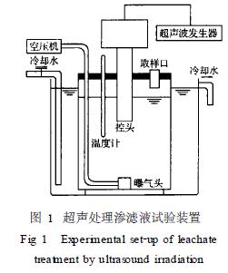 通常使用超過5年的填埋場滲濾液氨氮濃度高[2],過高的氨氮濃度不僅增加了滲濾液生化處理系統的負荷,并且隨著填埋時間的延長滲濾液中COD濃度呈下降趨勢,C/N也隨之降低,甚至會出現C/N<3的情況,造成營養比例的嚴重失調,而且產生的高濃度游離氨還會對微生物產生抑制作用[3],影響生化處理系統穩定有效的運行。目前滲濾液中氨氮的處理技術主要有吹脫法、電化學氧化法、化學沉淀法以及生物脫氮技術等[4]。近年來,超聲輻照作為一種高級氧化技術應用于治理水污染方面的研究,尤其是在治理廢水中有毒難降解污染物的研究方面取得了很大進展[5~7]。水在超聲輻照作用下,水中的微小氣泡核經歷振蕩、生長、收縮、崩潰等一系列動力學過程,產生瞬時的高溫高壓,同時生成氧化性極強的羥基自由基,使得水中的污染物在高溫高壓或羥基自由基的作用下降解[8]。