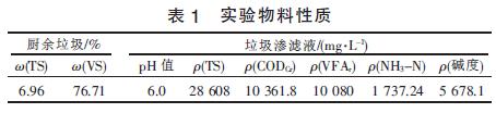 實驗所用的廚余垃圾取自西南交通大學(xué)北園生活區(qū)垃圾場,垃圾滲濾液取自成都長安垃圾填埋場,為早期滲濾液,實驗前先在中溫下培養(yǎng)一段時間,相關(guān)原料及滲濾液性質(zhì)見表1。
