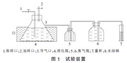 實驗采用批式進(jìn)料, 即將實驗物料一次性投入反應(yīng)器中,反應(yīng)結(jié)束后一次性排出,分別考察有機(jī)負(fù)荷為3 g/L 和30 g/L(以VS 計)下的厭氧消化情況。批式實驗裝置以1 L 抽濾瓶作為厭氧發(fā)酵罐,置于恒溫水浴中,保持溫度為35 ℃。消化產(chǎn)生的氣體進(jìn)入裝有飽和碳酸氫鈉溶液的集氣瓶中, 采用排水法收集。實驗裝置如圖1 所示。