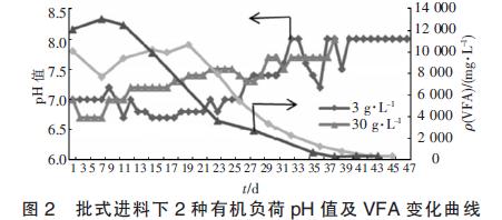 圖2 為3 g/L 和30 g/L 有機(jī)負(fù)荷(以VS 計)條件下pH 值及VFA 變化曲線。