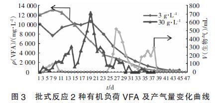 (2)在30 g/L 負(fù)荷(以VS 計)下反應(yīng)過程更為穩(wěn)定,pH 值在較長的時間內(nèi)處于厭氧微生物適宜的范圍內(nèi), 而在3 g/L 負(fù)荷下出現(xiàn)了一段時間的停滯期。2 種負(fù)荷反應(yīng)結(jié)束時,VFA 質(zhì)量濃度分別被降解至300,336 mg/L,說明消化效果良好。