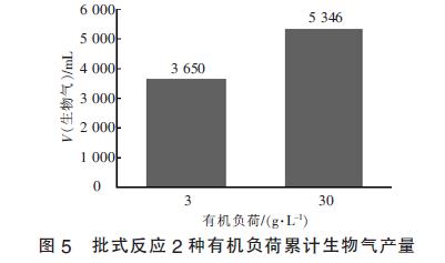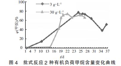 (3)在批式反應(yīng)條件下,3 g/L 負(fù)荷和30 g/L 負(fù)荷(以VS 計)均能順利進(jìn)入產(chǎn)甲烷階段,且甲烷體積分?jǐn)?shù)可達(dá)到理想水平(60% ~ 80%)。相比3 g/L 負(fù)荷,在30 g/L 負(fù)荷下系統(tǒng)更快進(jìn)入產(chǎn)甲烷階段,且穩(wěn)定產(chǎn)甲烷的時間更長,且累計生物氣產(chǎn)量比3 g/L負(fù)荷有了較大幅度的提升。(西南交通大學(xué)地球科學(xué)與環(huán)境工程學(xué)院)