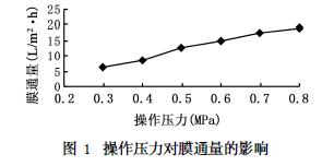 在恒定的流量( 20 L /h)和進水濃度(COD 為200 mg/L)下,實驗操作壓力從0. 3 Mpa增加到0. 8Mpa,每隔0. 1Mpa作為一個壓力工作區,每個工作區運行30分鐘,然后取樣分析不同壓力下膜通量和COD截留率的變化情況。具體參見http://www.bnynw.com更多相關技術文檔。