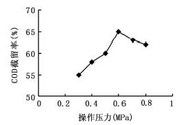 圖1和圖2分別是操作壓力對膜通量和COD截留率的影響曲線。從圖1可看出,隨著操作壓力的增大,膜通量幾乎呈線性增大趨勢,這一點可以從非平衡熱力學模型[ 4 - 6 ]來解釋。(東華大學環境科學與工程學院)