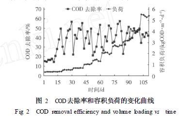 容積負荷直接反映了食物與微生物之間的平衡關系,它可影響反應器對有機物的去除率,而容積負荷過大是造成反應器酸化的直接原因。試驗過程中容積負荷與COD去除率的關系見圖2。