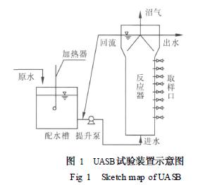 如圖1所示。圖1 UASB試驗裝置示意圖F ig.1 Sketch m ap ofUASB反應器從上到下可分為三相分離區、污泥床區和進水區三個部分。反應器內徑為15.4 cm,總高度為105 cm,其中三相分離器部分高度為25 cm,懸高度為67 cm,反應器有效容積為14.96 L。另外,沿高度方向在反應器壁上等間隔設置8個采樣口。通過自制恒溫控制儀對進水加熱,使反應器內的溫度控制在(35±2)℃。
