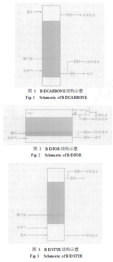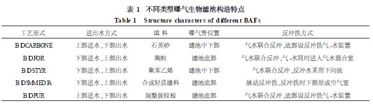 近年來曝氣生物濾池發展迅速,工藝形式不斷推陳出新, 曾先后出現過B IOCARBON、B IOFOR、B IOSTYR、B IOSMED I、B IOPUR、COLOX、DeepBed等形式,其中B IOCARBON、B IOFOR、B IOSTYR、B IOS2MED I、B IOPUR是現代曝氣生物濾池幾種典型的運行工藝, 在世界范圍內都有應用, 其構造特點見表1。B IOCARBON (圖1)為早期開發的工藝形式,現在曝氣生物濾池則多采用B IOFOR (圖2)和B IO2STYR (圖3)形式。