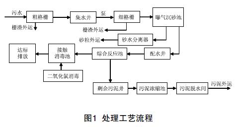 污水通過市政管網抽送至污水處理廠,經過回轉柵條式粗格柵去除大的雜物后流入集水井。而后通過潛水泵提升到回轉式細格柵去除無機物和細小懸浮物,然后自流入曝氣沉砂池(主要去除砂粒等無機物,并起到預曝氣作用),經配水井流入各個綜合反應池、消毒池后達標排放。其中綜合反應池包含有兼氧池、一段好氧曝氣池、缺氧池、二段好氧曝氣池、沉淀池、穩定池。