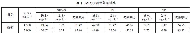 傳統(tǒng)除磷理論認(rèn)為, 排除的剩余污泥量越多, 即泥齡越短, 對(duì)磷的去除率就會(huì)越高, 但加大排泥量必然會(huì)導(dǎo)致MLSS降低。由于低的MLSS不利于膜氮效果, 因此工藝中要對(duì)MLSS適當(dāng)控制才能同時(shí)滿足脫氮、除磷功能要求。該廠的MLSS 設(shè)計(jì)值為4 500 mg/L, 運(yùn)行時(shí)除磷效果并不是很理想, 經(jīng)過(guò)調(diào)整并逐漸減少排泥量, 在將MLSS 提高至5 000 mg/L左右時(shí)發(fā)現(xiàn)除磷效果更好, 也相應(yīng)地保證了系統(tǒng)較好的硝化、脫氮效果。表1為MLSS調(diào)整前后的效果對(duì)比表。