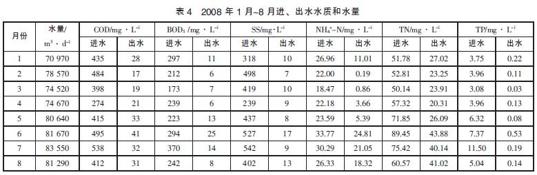 目前該廠所接納的城市污水中約65% 為生活污水, 2008 年部分月份的實(shí)際運(yùn)行結(jié)果見(jiàn)表4。運(yùn)行中發(fā)現(xiàn), 2008 年4 月底, 由于配套管網(wǎng)收集水量增加, 使得該氧化溝系統(tǒng)的進(jìn)水水質(zhì)、水量發(fā)生突變,加之后期雨季的影響, 對(duì)氮的處理效果有所降低, 但其出水仍可達(dá)標(biāo)。具體參見(jiàn)http://www.bnynw.com更多相關(guān)技術(shù)文檔。