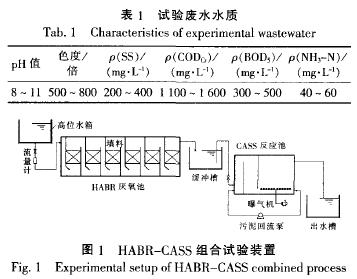 棉機織物印染加工包含退漿和絲光工序.其印染廢水具有水量大、有機污染物濃度高、色度深、堿度大、水質變化大等特點.屬于難處理的工業廢水 處理方法一般采用物化法和生化法組合工藝[1-3].廢水處理后基本能達標排放 物化工序中的吸附法需要使吸附劑再生.混凝法需要投加混凝劑.氣浮法需要投加氣浮劑和耗費大量的電能。從而導致棉機織物印染廢水的處理成本較高 為了降低其處理成本.本文通過對厭氧工序進行強化.來探索HABR—CASS組合生物工藝處理棉機織物印染廢水的可行性