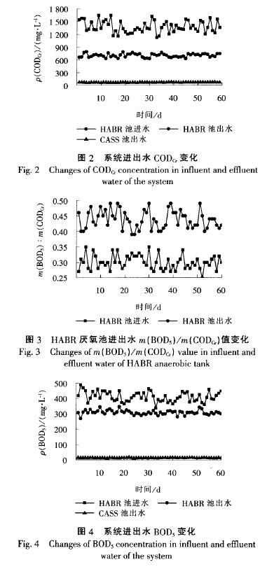 系統穩定運行2個月對有機物的去除情況見圖2~圖4。由圖2可知,在反應器COD&容積負荷為1.4 kg/(m3•d),進水CODo波動較大的情況下,HABR厭氧池對COD。的去除效果良好,平均去除率為48.8% ,與文獻[5]中的ABR反應器相比。HABR厭氧池對COD。的去除率提高4.3%。這是因為由ABR反應器增設填料構成的HABR厭氧池能利用填料加速污泥與氣泡分離.提高沉淀區域的泥水分離效率.降低污泥流失.從而能截留更多的生物量.增加反應器的有效泥量.提高了反應器的容積負荷和處理效果。由圖3、圖4可知,HABR厭氧池對BOD 的平均去除率僅為25.3%,但經過HABR厭氧池處理后,廢水的m(BOD )/m(COD。)均值由進水的0.30提高到出水的0.44,大大提高了廢水的可生化性.為后續的CASS反應池的進一步處理創造了有利的條件HABR厭氧池出水進入后續CASS反應池進行進一步處理 CASS反應池在時間序列上以推流方式運行.而各個反應區則以完全混合的方式運行.