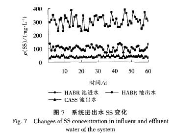 HABR厭氧池具有獨特的分室結構.反應器內的折流板迫使水流上下折流,使廢水與厭氧微生物充分接觸.大量的懸浮物在前面隔室中被有效去除.故SS去除率較高 由圖7可知.雖然HABR厭氧池進水SS濃度波動較大.但其出水SS平均質量濃度穩定在100.3 mg/L.對SS的平均去除率為66.9% CASS反應池在沉淀階段停止曝氣.只有進水而無出水.曝氣結束后沉淀階段整個反應池的面積均用于在近乎靜止的環境中進行泥水分離.故其固體通量很低,泥水分離效果良好。CASS反應池對SS的平均去除率為62.1%.出水SS平均質量濃度穩定在38.0 mg/L 系統對SS的總體去除率達到87.5% 。具體參見http://www.bnynw.com更多相關技術文檔。