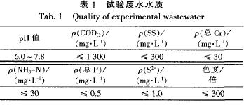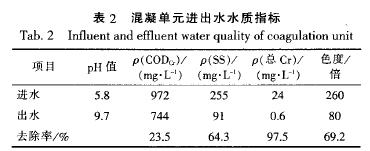 由表2可知.混凝對制革廢水的SS、色度和總Cr的去除效果很理想. 達到了利用混凝去除SS、色度和總Cr的目的; 隨著SS和色度的去除,COD 也有部分消減。