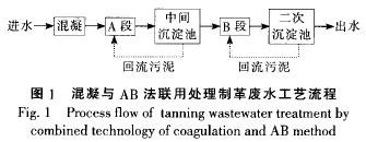 制革廢水的特點是有機污染濃度高、懸浮物質多、水量大,并含有一定的色度。國內制革廢水的處理一般采用生物法與物化法相結合的方法. 物化法一般采用沉淀、氣浮或混凝,生物法一般采用氧化溝、SBR或接觸氧化法。吸附一生物降解工藝(AB法)兼具污泥高效吸附和生物降解的功能,適合制革廢水有機負荷高的特點;同時為了降低生物處理的有機負荷,采用混凝作為預處理,再結合AB法。試驗取得了較理想的處理效果。