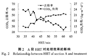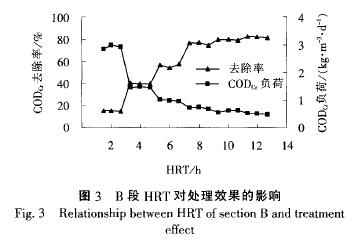 由圖2可知. 在35~60 min的6個HRT下,CODcr負荷從23.8 kg/m •d)到13.0 kg/(m •d)之間變化,達到一般活性污泥法的10倍左右。雖然COD。負荷很高,但是COD 。去除率在HRT大于50 min時已達到48% 左右,此時COD 負荷約為17.8 kg/(m •d);繼續延長HRT,CODcr去除率增加緩慢.但負荷下降卻很快.所以A段HRT確定為50~55 min較為合適由圖3可知,當HRT為2~6 h時,COD 負荷超過1.0 kg/(m3.d),但CODo去除率只有55%左右.出水也還達不到排放標準: 當HRT超過8h,CODo去除率達到75% 以上,COD。負荷在0.75 kg/(m3.d)以下:繼續延長HRT,污染物負荷下降、CODo去除率變化不大。綜合考慮,B段HRT確定為8~10 h較為合適。