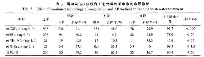調節制革廢水的pH值為8.8~10.0,按400mg/L投加PAC;混凝過程的澄清水調節pH值到6.5~7.8.再進入AB池:A段的HRT為50 min,污泥回流比為40% .控制DO的質量濃度為0.8~1.2 mg/L:B段的HRT為10 h, 污泥回流比為55%.控制DO的質量濃度為2.5~3.0 mg/L。聯合工藝連續運行了2個月.制革廢水的主要污染物指標見表3。具體參見http://www.bnynw.com更多相關技術文檔。