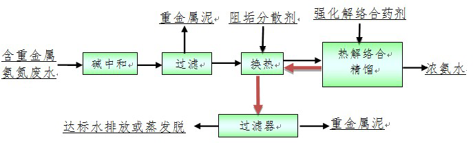 廢水首先與堿(如果回收重金屬則加NaOH,如果除氟則加石灰)反應,調節pH的同時脫除水中大部分重金屬離子,或氟離子、硫酸根離子等,物理分離顆粒物后再向廢水中添加阻垢分散劑,預熱后進入精餾塔在強化解絡合藥劑的作用下進行熱解絡合精餾,脫氨水與原水換熱后繼續利用過濾設備回收解絡合的重金屬氫氧化物,凈化水達標排放或繼續回收鹽,塔頂冷凝液得到16%以上的高純濃氨水直接回用于生產。該集成技術中的核心環節包括:廢水中重金屬與氨氮的絡合與解絡、精餾塔內件、阻垢分散技術、過程控制技術等等。