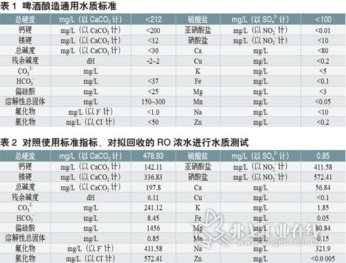 啤酒釀造通用水質標準參見表1,對擬回收的RO濃水進行測試見表2。