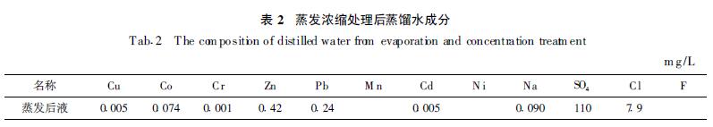 項目對廢水進行蒸發濃縮試驗,旨在考察蒸發濃縮后溶質走向及所得蒸餾水成分。蒸餾水成分分析結果見表2。
