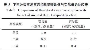 由表3可見,采用多效蒸發,比單效蒸發節能,比常壓蒸發節能更多,而第三效采用強制循環閃蒸方式結晶,傳熱效率高,循環力度大,蒸發速度快,受熱時間短,物料不易結焦與結污,設備便于清洗。而且廢水中的無機鹽可作為復鹽產品外銷或綜合利用,蒸餾水可以循環回用。