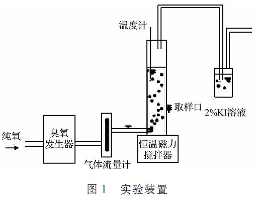 本實驗主要裝置為一自制的2l柱狀玻璃反應器,如圖1所示。實驗中臭氧由氧氣源臭氧發(fā)生器發(fā)生,預臭氧和主臭氧兩個步驟都在該裝置中進行。臭氧投加量通過改變通入反應器的臭氧氣體流量和通入臭氧的時間來調(diào)整。為使臭氧迅速溶解,反應器底部進氣口布有砂芯曝氣頭,并同時采用磁力攪拌器快速攪拌。反應器設有一個取樣口,采用注射器取樣。尾氣通過2%的KI溶液吸收后排向空氣中。