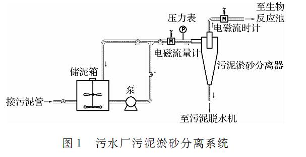 污水廠污泥淤砂分離系統如圖1所示,核心設備為自主開發的污泥淤砂分離器。實驗時,先將污水廠回流污泥泵入帶攪拌器的儲泥箱,通過調節閥門控制污泥混合液進入污泥淤砂分離器的壓力,污泥混合液通過分離器后被分離為底流污泥和溢流污泥。其中,底流污泥被輸送至污泥脫水機進行脫水,溢流污泥被回流至生物反應池。