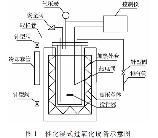 實驗裝置主體由1.0L高壓反應釜(威海匯鑫化工機械有限公司制造)和控制儀組成,設計最大反應壓力和最高溫度分別為20MPa和350°C。反應釜內配備攪拌器(最大轉速為1500r/min)和取樣裝置,取樣口連通釜內插底管,管口配針型閥,在針型閥后加裝一個不銹鋼的蛇形盤管,以提高取樣的可操作性和穩定性?刂苾x可以顯示并控制反應釜內的溫度和壓力,催化濕式過氧化設備示意圖見圖1。