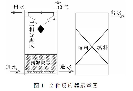 填料式水解酸化反應(yīng)器和UASB水解酸化反應(yīng)器在設(shè)計應(yīng)用形式上分別屬于膜法和泥法,它們都將反應(yīng)器內(nèi)的污泥停留時間(SRT)和水力停留時間(HRT)分離,以保證反應(yīng)器內(nèi)具有較高的微生物量,有利于反應(yīng)器的高效運行。2種反應(yīng)器構(gòu)造見圖1。