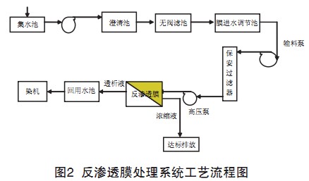 印染廢水經(jīng)過達標(biāo)處理后,在保證膜系統(tǒng)穩(wěn)定運行 的前提下,綜合考慮投資和運作費用,經(jīng)多次試驗證 明,工程水回收率設(shè)計為50%最為理想。反滲透膜處理 系統(tǒng)工藝流程見圖2。