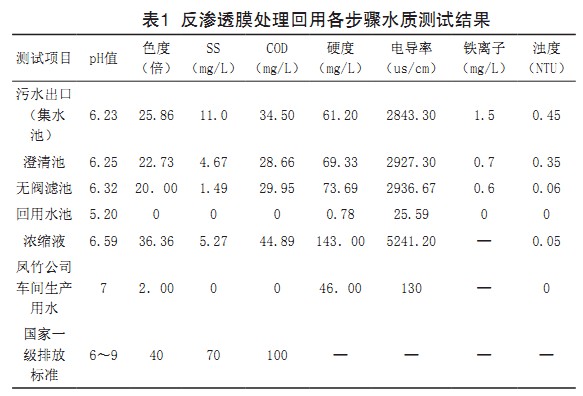 1.2.2 反滲透膜處理回用各步驟水質(zhì)測試 連續(xù)一周取各步驟水樣測試水質(zhì),測試結(jié)果的平均值見表1。