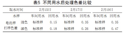 以車間生產(chǎn)用水的后處理樣為標(biāo)準樣,測試回用水 后處理樣的色差見表5。