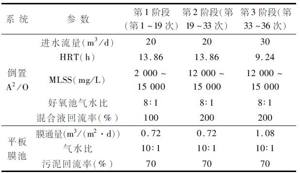 利用浮球閥控制系統水位,膜浸沒于膜池中,膜下方設穿孔曝氣管,膜通量恒定,通過時間繼電器控制抽吸泵間歇運行,根據膜廠家建議,平板膜運行9MiN停1MiN。好氧池與膜池采用鼓風機曝氣,控制好氧池氣水比為8:1,膜池氣水比為10:1,TMP通過抽吸泵出水口處的真空表觀測。每3天為一次水樣分析周期,反應器運行參數具體見表1。