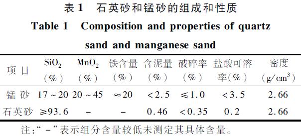 (3)濾料性質(zhì)。石英砂、錳砂的粒徑均在0.5~2MM范圍內(nèi),其組成和性質(zhì)見(jiàn)表1;纖維束濾料取自即墨市市北水廠,其組成纖維的長(zhǎng)為(20±5)MM,直徑為20~50μM;纖維束粗在100~150MM之間,孔隙率≥98%,表面積高達(dá)3500M2/M,截泥量可達(dá)到8kg/M。