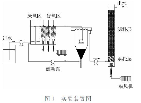 實驗用裝置如圖1所示,主要由水解酸化-接觸氧化反應器和BAF@反應器組成。其中水解酸化-接觸氧化反應器為主反應單元,厭氧區有效容積12L,好氧區有效容積18L。BAF反應器為深度處理單元,有機玻璃結構,內徑50mm,高2m,濾料層高度為1.8m,有效空床體積為14L,濾料材質為陶粒,粒徑范圍3~5mm。