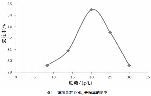 取60mL 稀釋過的水樣于五個燒杯中,分別加入相同量的NaCl 0.012 g(200 mg /L) ,各燒杯分別加入0.5 g(8.3 g /L) 、0.8 g(13.3 g /L) 、1.2 g(20g /L) 、1.5 g(25 g /L) 、1.8 g(30 g /L) 鐵粉,調節廢水pH 值均為3,攪拌30 min 后測定各水樣CODCr值,結果見圖1。