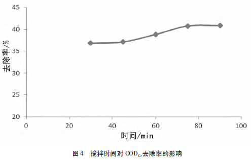 取60mL 稀釋過的水樣于五個燒杯中,分別加入相同量的NaCl 0.018 g(300 mg /L) ,然鐵粉量1.2g(20 g /L) ,調節溶液的pH 值為2,各燒杯攪拌時間對分別為30,45,60,75,90 min 后測定各水樣CODCr值,結果見圖4。