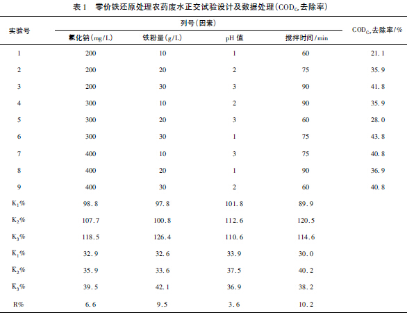 卷煙焦油廢水的原水樣色度較深,深棕色,氣味大,較粘稠,水樣中的CODCr含量高。將原水樣稀釋約1300 倍(稀釋完后進行了實驗驗證,結果可行) 。稀釋后的水樣呈土色,色度比原水樣小,水樣中的CODCr值大大降低。通過多組無針對性實驗可得大致的實驗藥品投加量和實驗條件:廢水中NaCl 質量濃度在200 mg /L 左右,鐵粉量在20 g /L 左右,pH值在3 左右,攪拌時間在30 min 左右。通過機械攪拌器進行攪拌使反應充分進行,反應結束后用氫氧化鈉調節水樣的pH 值至10 左右,測定處理后水樣和原水樣的CODCr值,得出CODCr的去除率。