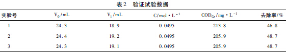 由上述正交試驗的數據分析可得最佳組合條件為氯化鈉量為0.024 g(400 mg /L) ,鐵粉量為1.8 g(30 g /L) ,酸的pH 值為2,攪拌時間為75 min。得出最佳條件后,為了驗證這是否為最佳條件,在該條件下的CODCr的去除率是否是最高,又做了三組平行的驗證實驗,見表2。